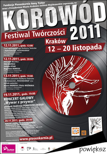 Czwarta odsłona Festiwalu Twórczości KOROWÓD zawierać będzie ogólnopolski Konkurs Twórców i Wykonawców ?PIOSENKARNIA?, recitale autorskie, a także koncert galowy pt.: ?Wywar z przywar? poświęcony twórczości Andrzeja Poniedzielskiego – autora wielu wspaniałych poetyckich piosenek, który stworzył swój własny styl operowania słowem zabarwiony nutą humoru i satyry.