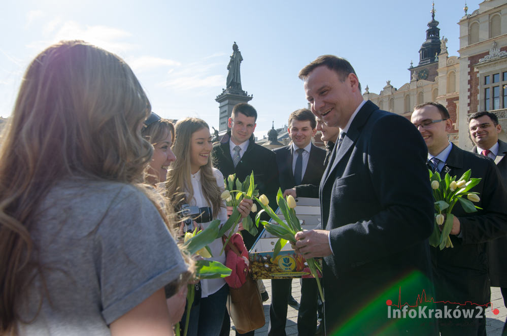 Dziś na Rynku Głównym w Krakowie, Andrzej Duda kandydat na prezydenta RP składał życzenia i rozdawał kwiaty z okazji Dnia Kobiet. Kandydat na Prezydenta RP podarował krakowiankom kwiaty nazwane imieniem pierwszej damy Marii Kaczyńskiej, która zginęła w katastrofie smoleńskiej.