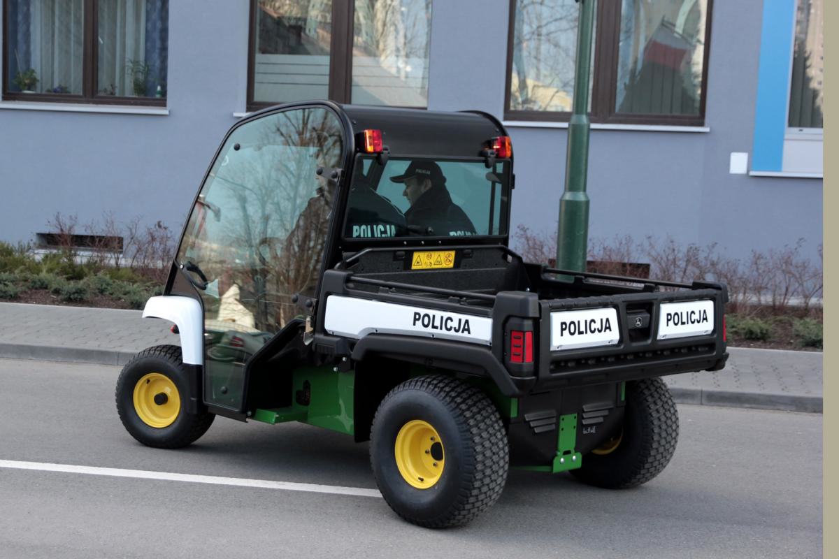 Pojazd wolnobieżny ? podobny do meleksa – o napędzie elektrycznym model Gator TE użyczyła do testów jedna z firm, od której wcześniej małopolska Policja zakupiła ciągnik komunalny John Deere, aktualnie używany do utrzymania porządku na terenach podległych Policji.