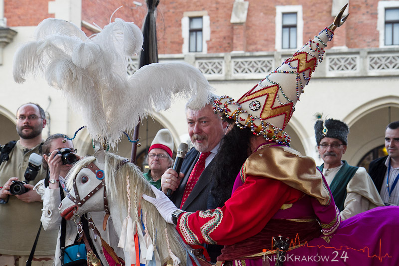 Przybycie Lajkonika na Rynek Główny poprzedzi widowisko na scenie pod Wieżą Ratuszową. O godzinie 18.00 zaprezentuje się zespół tatarski Buńczuk. Dzieci i młodzież zaprezentują folklor mniejszości tatarskiej w Polsce (taniec, poezja, śpiew i tradycyjne stroje). O godzinie 18.30 wrócimy natomiast ze Wschodu do Krakowa. Balet Dworski Cracovia Danza przedstawi spektakl ?Alla Polacca”. W trakcie występu zaprezentowane zostaną różne formy tańców polskich, także szlacheckich. Przedstawienie, nawiązujące do staropolskiej tradycji, zaprezentuje najbardziej znane i popularne polskie tańce z ówczesnego repertuaru, takie jak taniec Uroczysty, Wesoły czy żywiołowy Wyrwany. Oryginalnym elementem spektaklu będą zabawy wokół tradycyjnych postaci z polskich legend ? diabła i Pana Twardowskiego dosiadającego koguta.