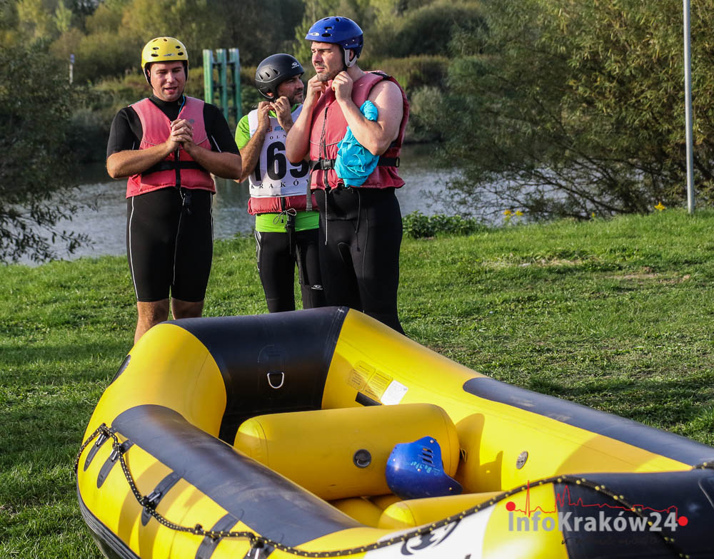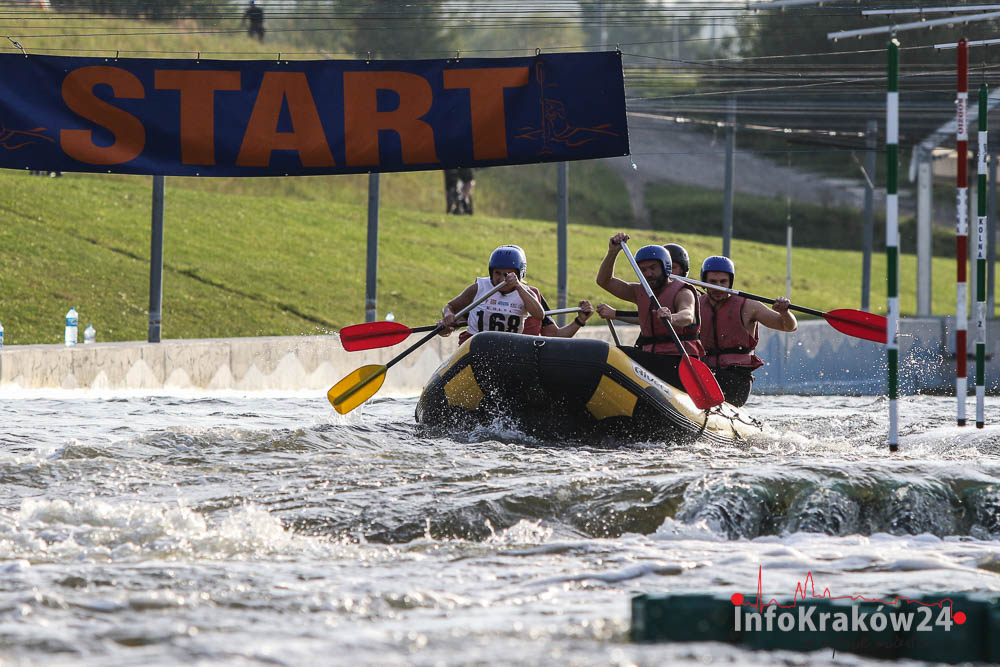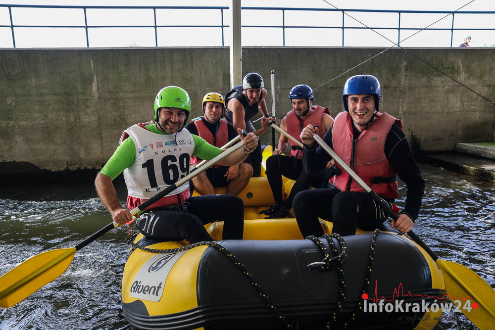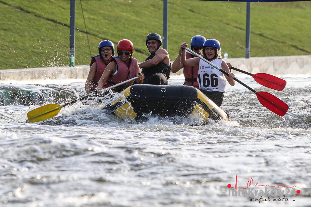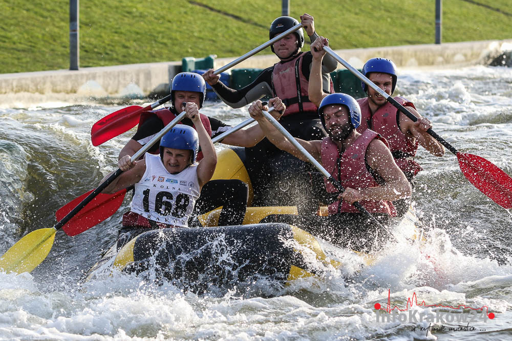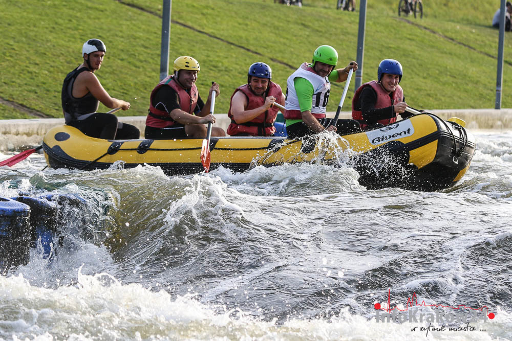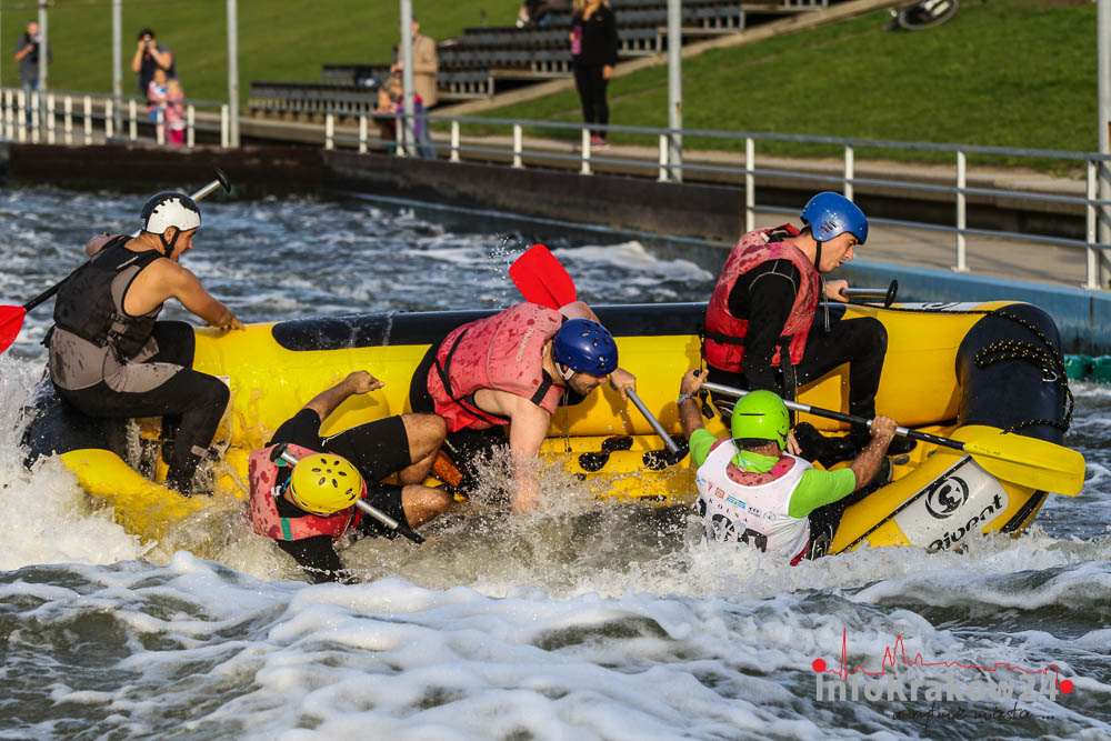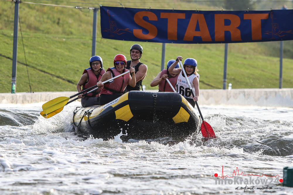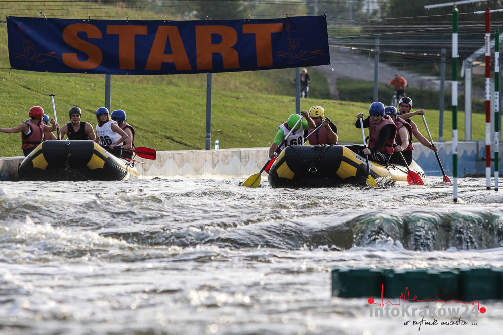 Czteroosobowe ekipy ze sternikiem / doświadczony kajakarz z Krakowskiego Kluby Kajakowego/ miały do pokonania prawie 300 metrowej długości spieniony przez wodę tor. Zadanie było proste jak najszybciej dotrzeć do mety. Do zwycięstwa liczył się najlepszy czas z dwóch spływów. Emocji było sporo, dopisali: pogoda i kibice. Widowiskowa była także przewrotka jednej z drużyn. W ferworze walki zawodnicy wpadli do wody i do brzegu musieli dopłynąć wpław.