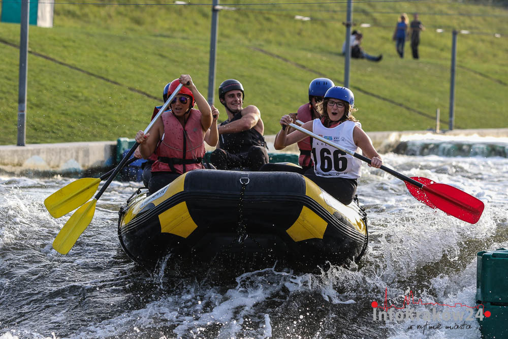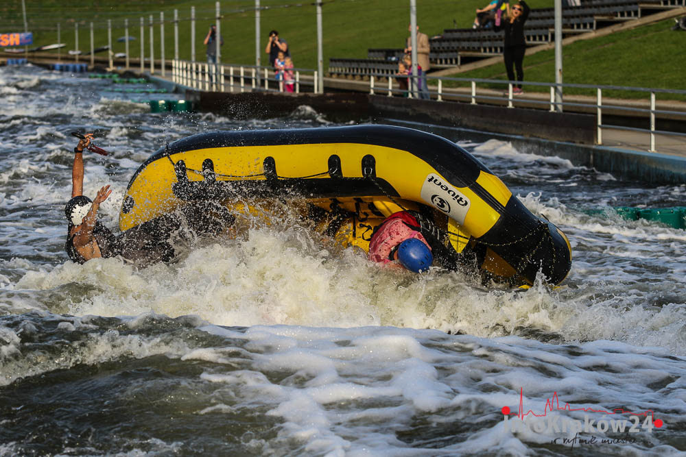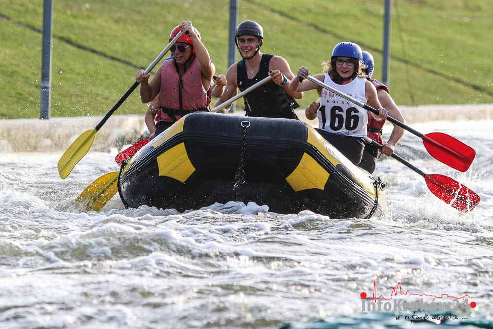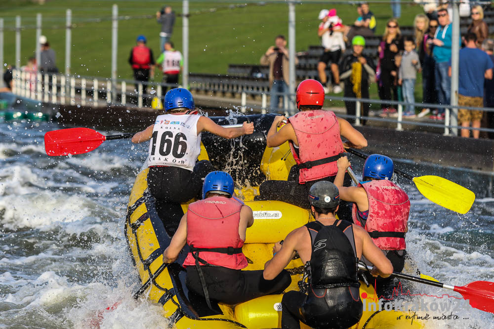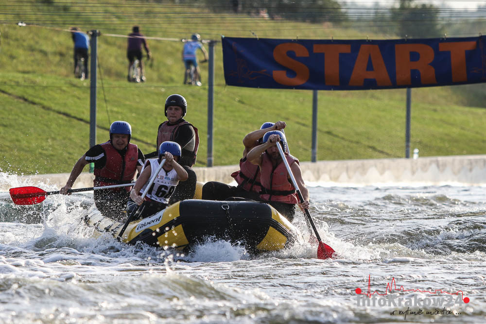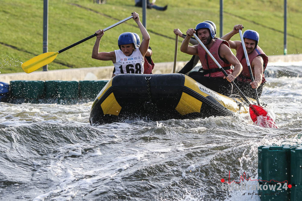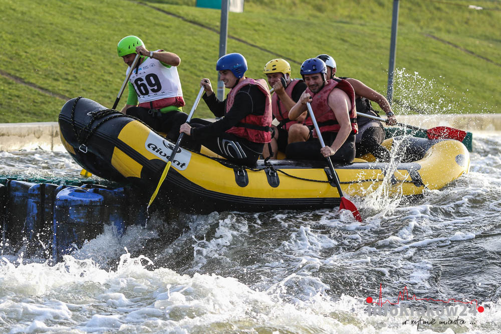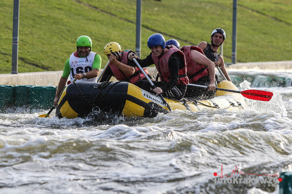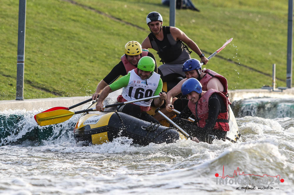 Czteroosobowe ekipy ze sternikiem / doświadczony kajakarz z Krakowskiego Kluby Kajakowego/ miały do pokonania prawie 300 metrowej długości spieniony przez wodę tor. Zadanie było proste jak najszybciej dotrzeć do mety. Do zwycięstwa liczył się najlepszy czas z dwóch spływów. Emocji było sporo, dopisali: pogoda i kibice. Widowiskowa była także przewrotka jednej z drużyn. W ferworze walki zawodnicy wpadli do wody i do brzegu musieli dopłynąć wpław.