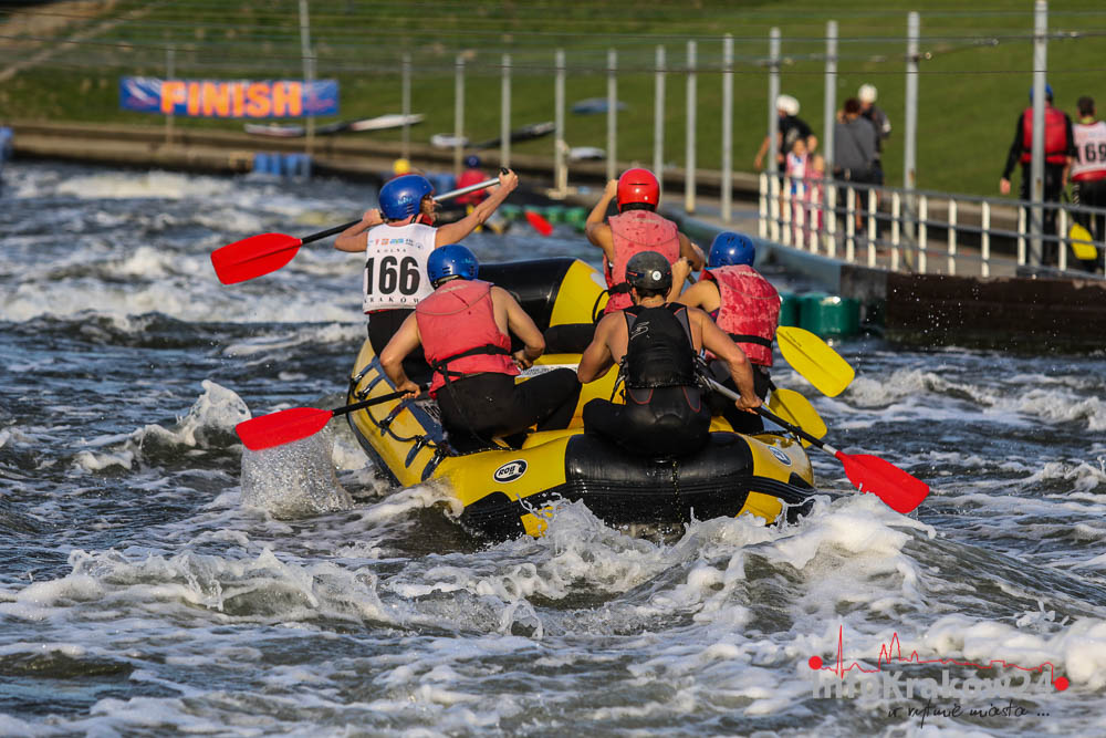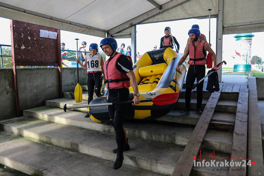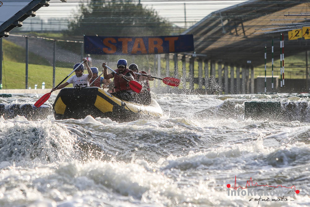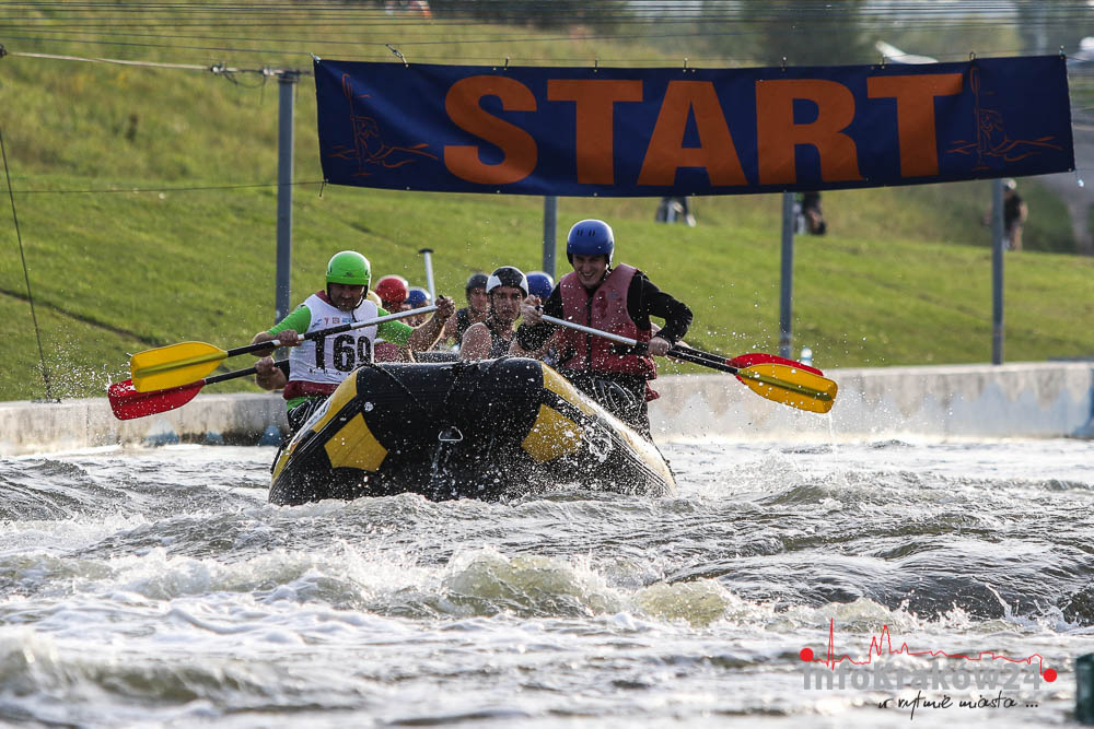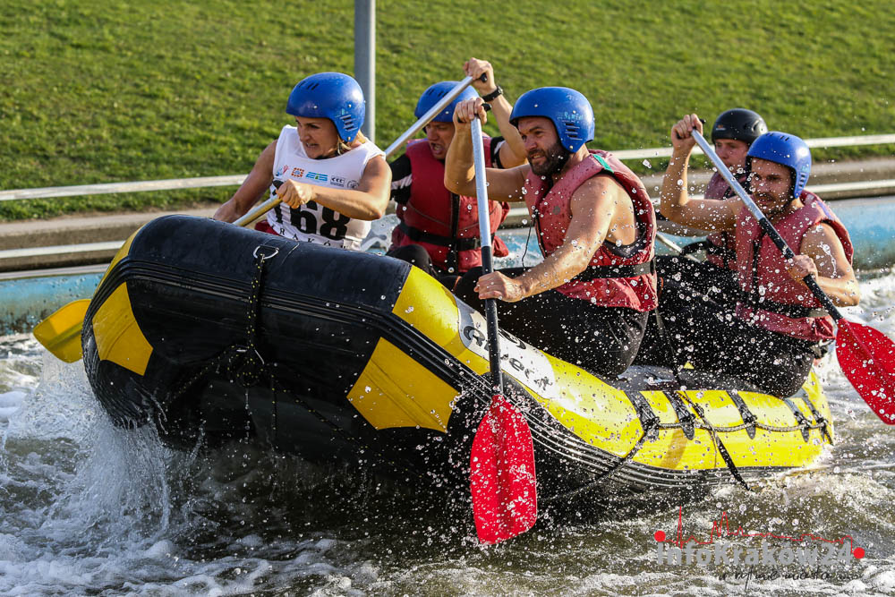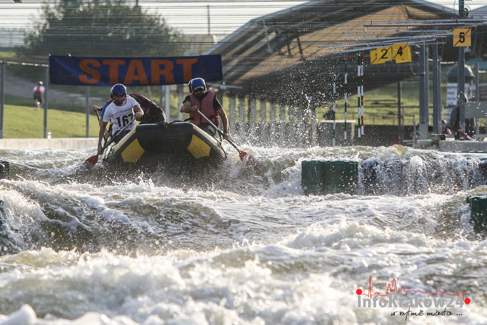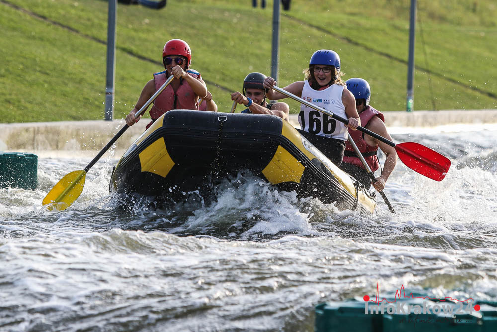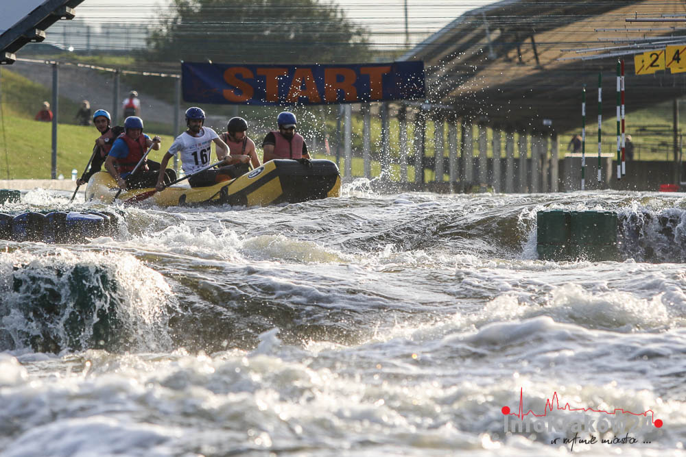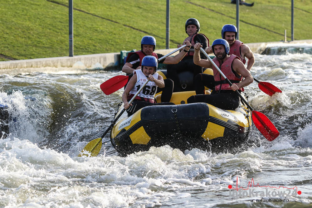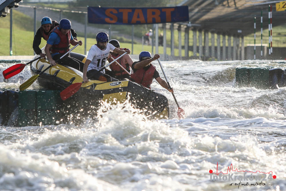 Czteroosobowe ekipy ze sternikiem / doświadczony kajakarz z Krakowskiego Kluby Kajakowego/ miały do pokonania prawie 300 metrowej długości spieniony przez wodę tor. Zadanie było proste jak najszybciej dotrzeć do mety. Do zwycięstwa liczył się najlepszy czas z dwóch spływów. Emocji było sporo, dopisali: pogoda i kibice. Widowiskowa była także przewrotka jednej z drużyn. W ferworze walki zawodnicy wpadli do wody i do brzegu musieli dopłynąć wpław.