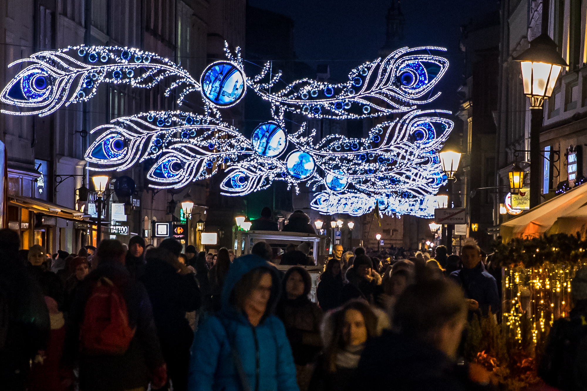 W bezpośredniej okolicy Rynku Głównego, ronda Matecznego oraz na placu Centralnym im. Ronalda Reagana udekorowane zostały lampy. Na ulicach Floriańskiej, Siennej, Grodzkiej, Brackiej, Szewskiej i Sławkowskiej pojawiły się elementy podwieszane – motyw pawiego pióra, zwieńczony charakterystycznym „okiem” oraz zaśnieżone gałązki „młodopolskie”. Nie zabrakło też charakterystycznego napisu świetlnego KRAKÓW, który stanął tym razem go na placu Szczepańskim. Cała dekoracja świetlna to niemal milion lampek.